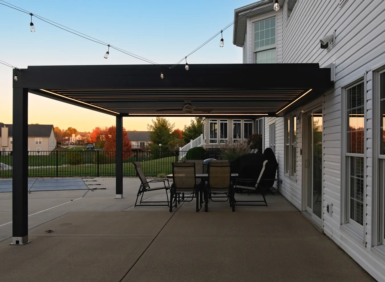 Louvered pergolas operate differently. These are engineered aluminum systems with motorized, adjustable roof blades that open and close for sun or rain protection. Most louvered pergolas begin around $45,000–$60,000 and commonly range from $65,000–$110,000+ depending on size, automation features, drainage integration, and electrical requirements.